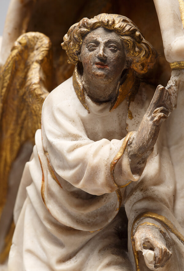 Die beiden Reliefs stammen aus dem 15. Jahrhundert, der Blütezeit der Alabasterskulptur. Alabaster ist weicher als Marmor oder Kalkstein und lässt sich besonders fein bearbeiten. Im frühen 15. Jahrhundert war das Material bei fürstlichen und kirchlichen Auftraggebern sehr beliebt. Es wurde etwa zur Ausschmückung von Grabmälern und Altären verwendet. Die beiden Reliefs gehören zu den kostbarsten Zeugnissen ihrer Zeit. In ihrer Darstellung bilden sie eine Einheit. Zu sehen ist die Verkündigung des Erzengels Gabriel an Maria. Beide Figuren sind von einer gotischen Rahmenform umgeben, einem sogenannten Vierpass. Innerhalb dieser Rahmung sind die Bildfelder geprägt von dem luftig bewegten Spiel der Gewänder und Spruchbänder. Die Körper der Figuren sind unter den Gewändern kaum zu erkennen. Besonders Maria wirkt wie eine schwerelose Himmelserscheinung. Sicher ist, dass beide Reliefs auf einem Untergrund angebracht waren. Aus welchem Zusammenhang sie stammen und ob sie noch mit weiteren Darstellungen verbunden waren, ist nicht mehr bekannt. In jedem Fall gehörten die Reliefs zu einem kostbaren Ausstattungsstück im Innenraum einer Kirche, zum Beispiel einem Altarretabel.