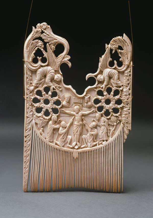 Dieser Kamm war kein Alltagsgegenstand, was an der kostbaren Schnitzerei zu erkennen ist. Derartige Kämme verwendete man bei der Salbung eines Königs oder bei der Bischofsweihe. Priester benutzten einen Kamm, um ihr Haar zu ordnen, nachdem sie die Gewänder für die Messe anlegt hatten. Neben diesem praktischen Nutzen hatte der Kamm eine symbolische Funktion. Das Ordnen der Haare diente als Zeichen der Reinigung und Ordnung der Gedanken. Dieser Kamm ist eine filigrane Schnitzarbeit aus Elfenbein. Im Mittelpunkt befindet sich Jesus am Kreuz. Zu beiden Seiten knien römische Soldaten: Stephaton mit dem Essigschwamm und Longinus mit dem Speer. Maria und Johannes stehen links und rechts vom Geschehen.