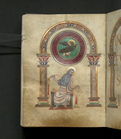 Saint-Amand, um 860-880, Pergament, 26 x 19,2cm;Einband, Köln, um 1160-1170, Inv.-Nr. G 531, fol. 151v-152r, Evangelistenbild des Johannes und Titelseite, Museum Schnütgen /aus der Sammlung F.F. Wallraf)