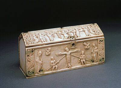 Längliche Elfenbein-/Knochenschatulle mit Reliefs: vorne eine Kreuzigungsszene mit mehreren Figuren, oben auf dem Deckel weitere erzählende Figurenfriese und ornamentale Flechtmuster; Studioaufnahme vor dunklem Hintergrund